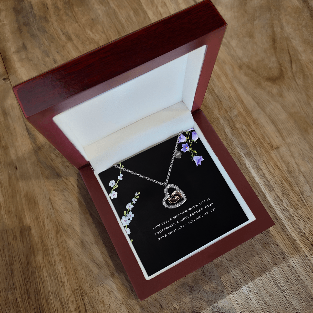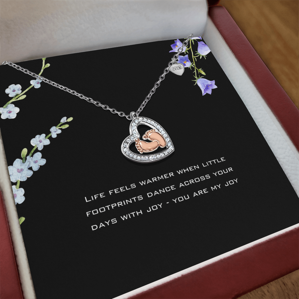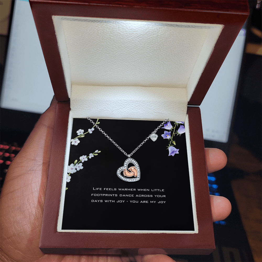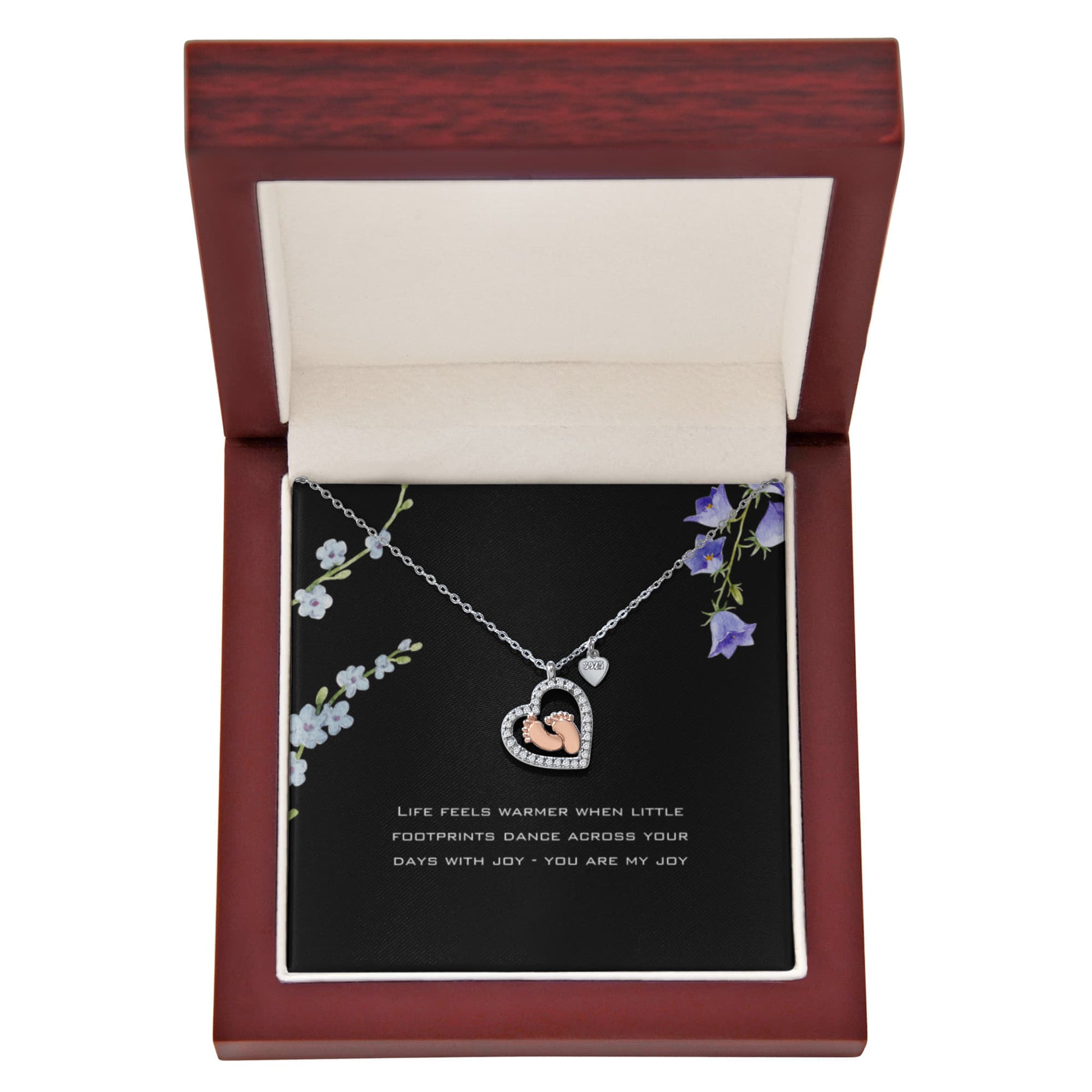 This Baby Feet Heart Necklace has a heart-shaped frame adorned with shimmering cubic zirconia, surrounding a delicate pair of rose gold baby feet. A touching tribute to motherhood and new life, this necklace is the perfect way to celebrate a new mom, a cherished child, or a growing family