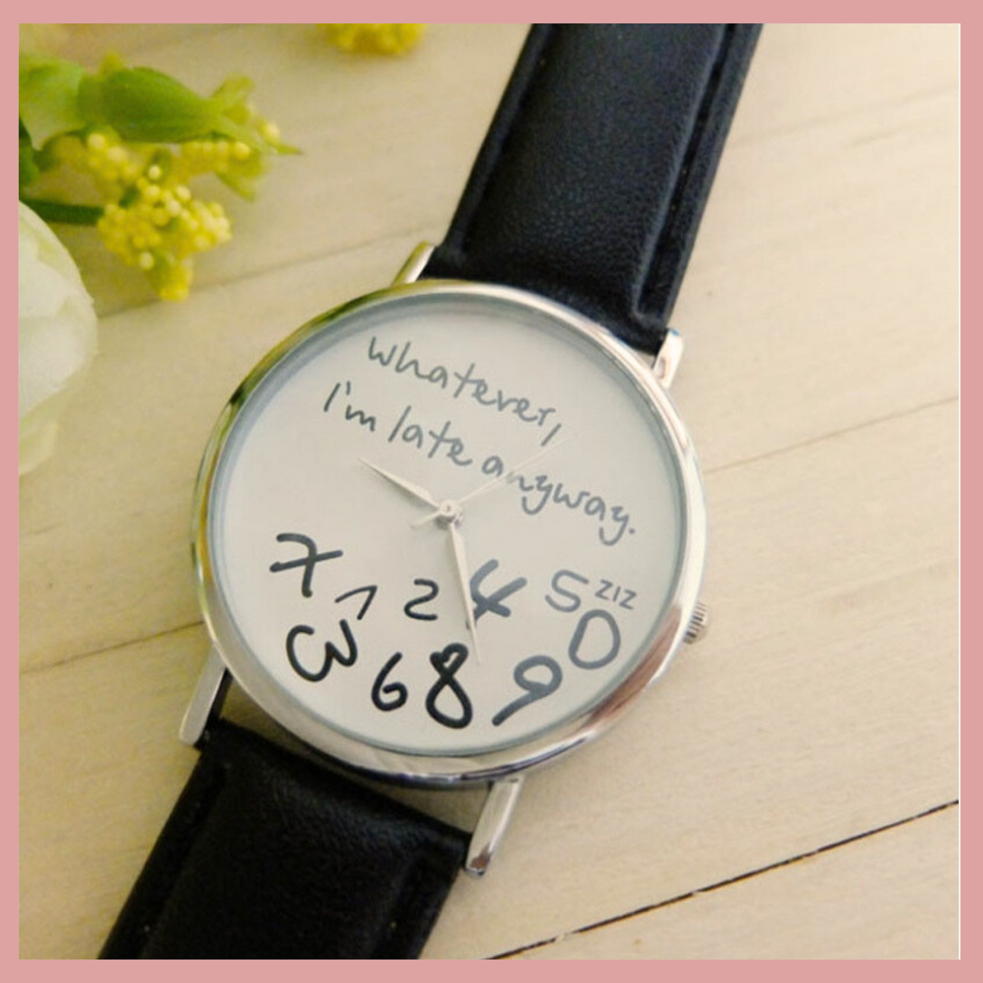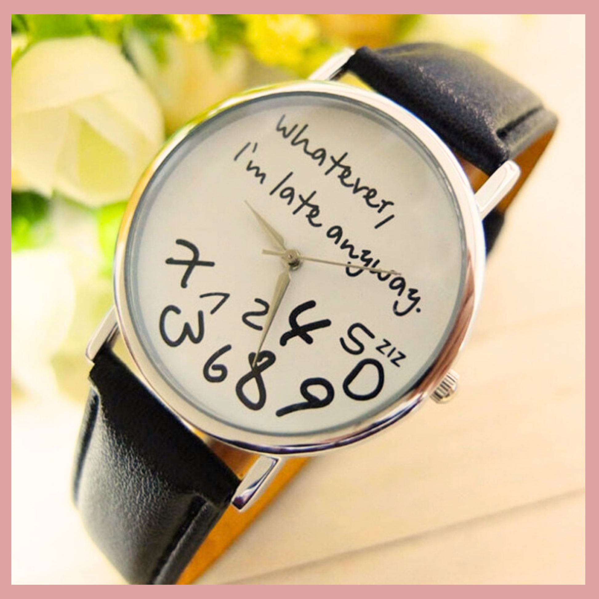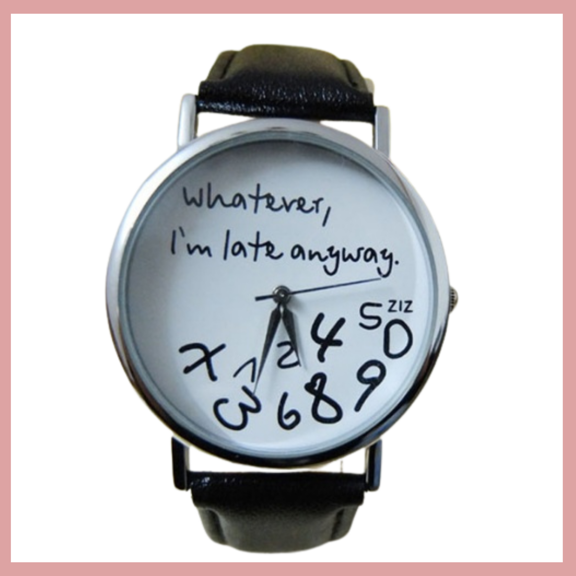 The "Whatever, I’m Late Anyways" watch is perfect for those who embrace a carefree spirit, with its whimsical, scattered numbers and playful message that remind you time is just a suggestion—fashionably late has never looked so good!