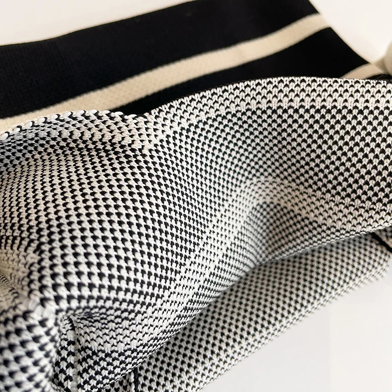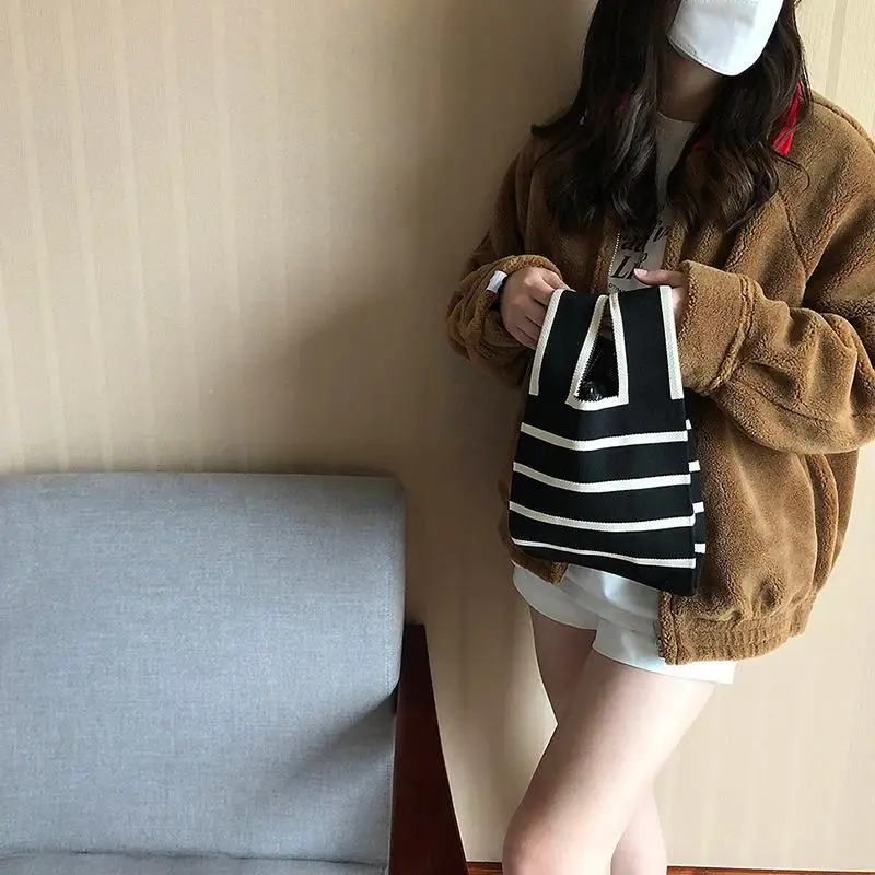 Women Handmade Knitted Small Handbag Casual Wrist Bag Wide Stripe Shopper Mini Tote Student Reusable Shoulder Bag